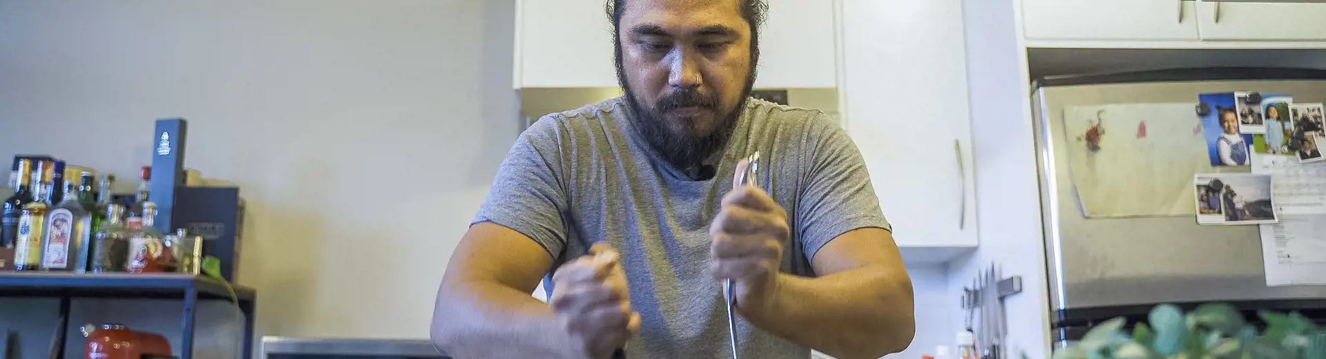 Quand j’ai perdu mon emploi plus tôt cette année à cause de la pandémie, tout a changé. Je suis quelqu’un de sociable – j’adore sortir et voir mes amis. Du jour au lendemain, j’ai eu l’impression de vivre dans une bulle. Je me sentais déprimé, incertain quant à mon avenir. J’ai donc commencé à cuisiner comme moyen de retrouver un peu de normalité. Je voulais transformer mes angoisses en quelque chose de positif. Tu sais, la cuisine a quelque chose de magique. C’est comme la musique. La nourriture et la musique sont des expériences universelles. Peu importe la langue qu’on parle ou la culture d’où l’on vient – tout peut se communiquer à travers elles. J’ai commencé dans la peur et l’incertitude, et c’est devenu tout ce que j’aime. J’ai continué à cuisiner, encore et encore… et maintenant, j’en suis là.